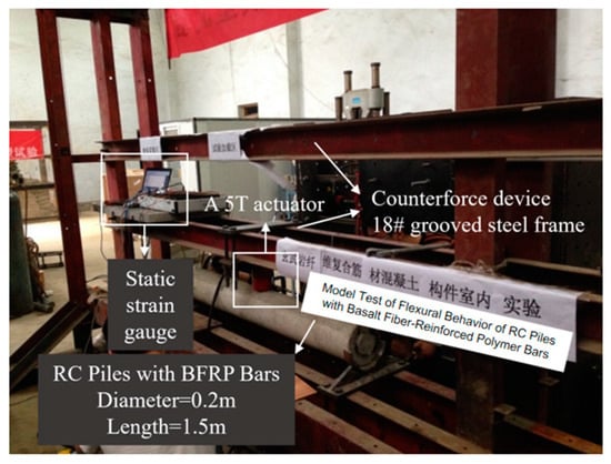 In comparison to steel bars, BFRPB (Basalt Fiber-Reinforced Polymer Bars) not only have the advantages of high strength and light weight but also saves about 20% on cost [4]. And its corrosion resistance, durability, and rate of loss of bond strength with concrete are superior to GFRP’s and CFRP’s [5,6]. The production of basalt fiber is also less wasteful and can degrade directly to the surrounding environment [7]. Huo et al. [8] studied the physical and mechanical properties of BFRP bars and found the BFRP bar is obviously superior in the aspects of tensile strength, corrosion resistance, etc.; Wu et al. [9,10] evaluated the residual tensile properties of unstressed and stressed BFRP bars exposed to four types of simulated harsh environments. The results showed that the effect on the durability of BFRP bars exposed to acid, salt, and deionized water was less than that for bars exposed to alkaline solution. Bai et al. [11], based on the indoor pull-out test and field test made by the predecessors, the technical indicators of BFRP bars, such as tensile strength, elastic modulus, bond strength, and corrosion resistance, were summarized and analyzed. The research works mainly introduce the progress of BFRP bars in terms of tests, theory and numerical calculation [12,13,14,15,16]. The tensile modulus of the composite fiber is believed to be primarily influenced by the bar diameter and the amount of spiked steel wire [17,18]. The structural properties of reinforced composite concrete are also discussed through in-door testing, on-site testing, and simulation analysis [19,20,21,22]. The shear strength and damage characteristics of BFRP beams of continuous hoop-reinforced concrete were obtained [23,24,25]. At the same time, the influence of the hoop ratio, shear span ratio, and longitudinal tension ratio on the shear strength of the concrete are also analyzed based on the results of the experimental research works [26,27,28,29]. The effectiveness of the externally bonded BFRP grids is systematically studied from the bond behavior of the interface between BFRP grids and concrete, the static behavior of the strengthened members, and the fatigue behavior of the strengthened members [30,31,32]. However, research is currently focused on the properties and application effects of flexural members and aims to enhance the ductility of concrete by introducing a specific quantity of basalt fiber, thereby reducing the hazards associated with the brittle failure of this composite structure [33,34]. And compared the bond strength degradation characteristics of BFRP bars, ordinary steel bars embedded in concrete in a single-corrosive environment coupled with high–low temperatures [35,36,37,38]. There have been few studies of circular flexure members in foundation pit and slope engineering, particularly on the relatively accurate formula to calculate the load-carrying capacity of the BFRP-reinforced concrete and the practical application of BFRP as reinforcement for support structures.