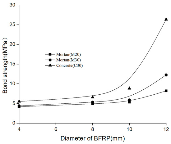 The results of this study demonstrate that different types of BFRP and cement substrates have different bond strengths. To further explain the relationship between bar diameter and cement substrate bond strength, tensile tests of BFRPB with a diameter of 6 mm and a diameter of 12 mm were added. This relationship is shown in Figure 8. In general terms, the larger the bar diameter, the higher the bond strength. A large amount of quartz sand is embedded in the BFRP bars; as the bars increase in diameter and the specific surface area of the various cement substrates increases, the friction between the contact and the cement substrate increases as well. Specifically, the larger the diameter of the reinforcement, the more sand will adhere to the surface of the reinforcement, and the depth of the ribs will also increase, thereby enhancing the mechanical biting force between the reinforcement and the concrete; moreover, the surface area in contact with the concrete will also increase. Despite varying degrees of sand adherence, rib entanglement depth, and concrete contact area, the reinforcement material with a 12 mm diameter significantly exceeds the others. Consequently, the abrupt alterations in the strength of bonding could be attributed more to the mechanical force exerted during biting between the reinforcement substance and the concrete. Therefore, it is recommended for commonly used diameter engineering anchors, that M20 and M30 mortar have a BFRP bond strength of approximately 5–6 MPa and C30 concrete of about 8 MPa.
