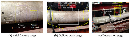 ② Axial fracture stage. At this point, the first axial crack appears from the bottom of the stack until the diagonal crack appears, as can be seen in Figure 9a. The bottom of the pile produces the first axial crack, which is small in length and width. As the load increases, the size of the crack increases, and a second or third crack is more likely to form. The axial fissure is also slightly forked, and the end of the limb is slightly upturned.