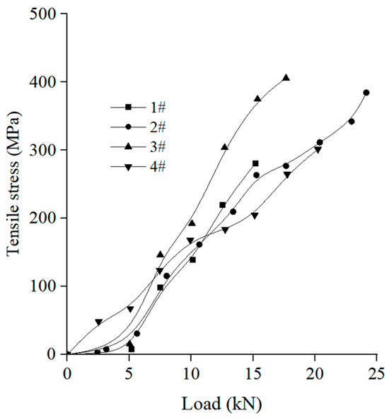The tensile stress variation curve of BFRPB is shown in Figure 10. The curve shows that BFRPB stress increases with increasing load. The 1#, 2#, 3# piles showed significant initial cracking with a sustained load of 5.04 kN. After the 4# pile is subjected to load, it enters the initial state of cracking more quickly than the others. This is because pile 4# has the highest allotment, a small concrete cross-sectional area. As a result, its tensile strength is low and easily cracked. Before the initial fracture of the pile structure, the stress of the BFRP increases slowly with the load. The tensile strength of the BFRP in tension inside the 1#, 2#, 3# piles is only 1–2 MPa under the load of 5.04 kN, which is equivalent to the tensile strength of the concrete, indicating that the tensile strength on the tensile zone is shared by both the BFRP and the concrete at that point in time. After the pile structure cracks, the tensile stress of the bar rises rapidly. When the load is 10 kN, the tensile stress reaches 140~190 MPa; the stress increases about 100 times with the load. The main bar stress then increases with increasing load until pile failure occurs. But the BFRP does not show the same yield phase as steel.