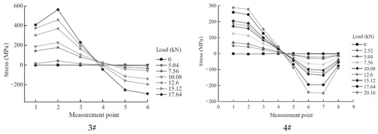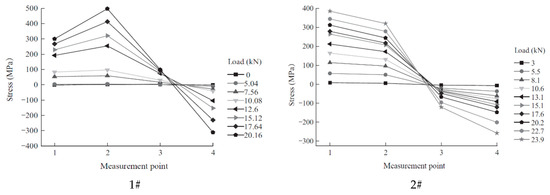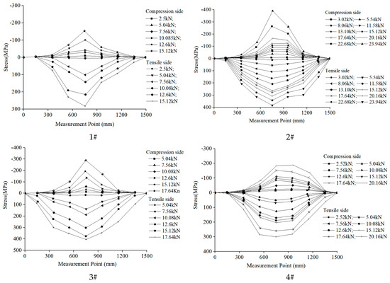 Figure 11 shows the stress–strain curve of the main bar of the pile structure, of which 750 mm is the mid-span position, positive stress is tensile and negative stress is compressive. From the curves, it can be seen that both sides of the span are well symmetrical, the stress in the mid-span is largest, and the stress at both ends gradually decreases. Prior to the initial crack, the pile structure did not have a crack; the vertical deflection, stress, and strain were low; and the BFRP-reinforced concrete pile exhibited elastic properties. BFRPB experience a rapid increase in tensile stress after tensile zone concrete cracking, and there is no obvious change in stress behavior during the tensile phase. Two aspects of the variation in compressive and tensile strength are different: ① The main bars under tension are located near the midspan, whereas the bar beyond the 400 mm away mid-span experiences very little stress. ② The tensile stress of the BFRP tendons increases with increasing load, but compressive stress suddenly increases. The mutant loads of plies 1# to 4# were 12.6 kN, 22.68 kN, 12.6 kN, and 17.6 kN, respectively. The sudden increase in the compressive stress could be due to the fact that the compressive side enters a plastic region.
