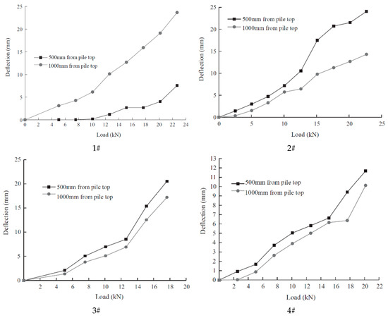 Table 7 shows the bearing capacity of RC piles with BFRP obtained through experimentation. It can be seen from Table 7 that the load and strain of the 1#, 2#, 3# piles are basically the same in the initial state of cracking. But the 4# pile has the least load and strain. Since the 4# pile has the highest BFRP allocation, it causes the least amount of concrete, so the concrete’s tensile strength is poor. Due to the lower modulus of the BFRP, piles can more easily penetrate the deflection boundaries. So, the normal operating condition of all components is a deflection–restriction control. By comparing the deformation and load-carrying capacity of the pile in the initial state of cracking, the 1#, 2#, and 3# piles have an initial cracking capacity of 67%, 56%, and 51% of the normal capacity, respectively, which is much greater than the steel reinforcement ratio. The reason for this is that the modulus of the BFRP bars is low, which can be coordinated with the deformation of the concrete and is in a long-cracked state in the initial phase.