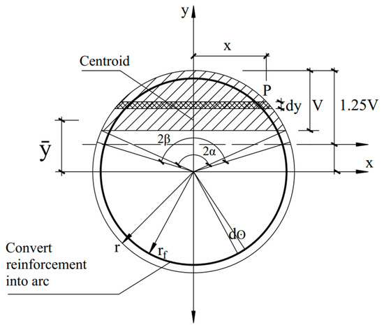 As shown in Figure 14, the equation for circle is x2 + y2 = r2, x = rcost, y = rsint (t is the angle between OP and x-axis). The set height of the compression arched area is V = ηr, and the right half of the center of the bow is α = arccos (1 − η). The distance from the neutralizing axis x-x to the edge of the compression zone is V1 = V/β1. Figure 14 shows the area microelement of the arched compression zone is as follows: