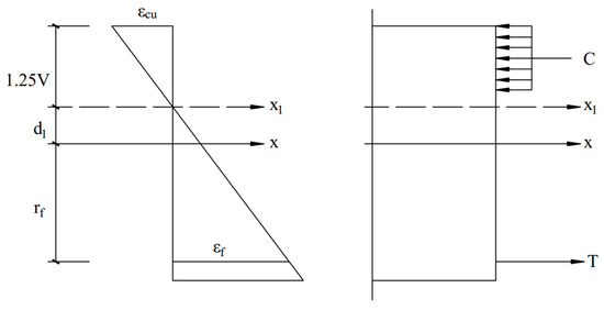 Uniform reinforcement throughout the section is shown in Figure 14, so the area of reinforcement is Af. To simplify the calculation, the BFRP are converted to curved sheets with a thickness of . The maximum strain of the concrete at the edge of the compression zone is εcu, and the maximum strain of the BFRP tendon in the tensile zone is assumed to be