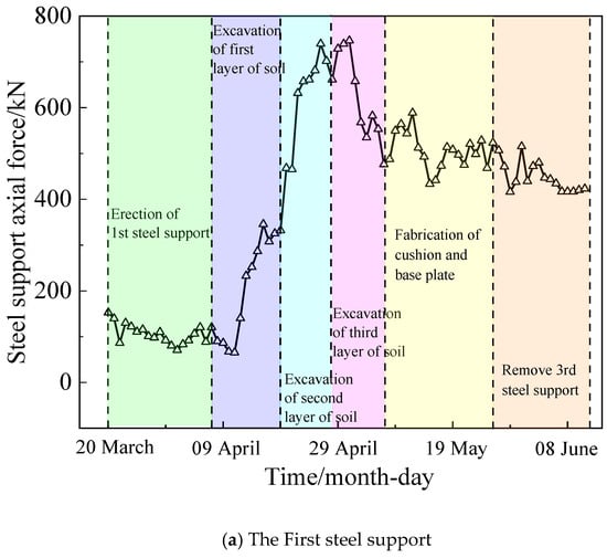 As can be seen from Figure 8a, between 20 March and 8 April, the axial force value at measurement point ZL1-1 gradually decreased. The axial force of the steel support gradually decreased because the soil underneath was not excavated immediately after the first support erection was completed, and the pre-axial force value of the steel support began to dissipate after it was disturbed by the surrounding soil. Afterwards, with the excavation of the first and second layers of soil, the axial force value of the ZL1-1 measurement point began to increase, and when the excavation of the second layer of soil was completed, the axial force of the DC joint reached a maximum value of 752 kN. During the excavation of the third layer of soil, the axial force value of the DC joint was gradually reduced to about 500 kN due to the disturbance of the first steel support by the construction, and the loss of axial force caused by the disturbance of the DC joint was mainly attributed to the fact that it is easy to be disturbed by construction, which causes the loss of axial force. During the subsequent construction process, the axial force value at measurement point ZL1-1 fluctuates within a small range, but tends to be stabilized on the whole.