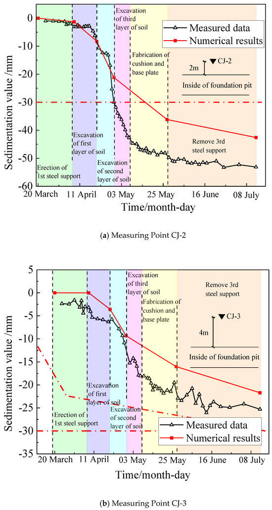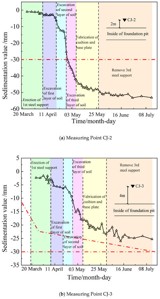 From the change rule of measurement point CJ-2, shown in Figure 11a, it can be seen that the pit is more stable during the erection of steel supports and the excavation of the first layer of soil; the settlement value of measurement point CJ-2 is smaller, and the whole structure tends to be stable. The second layer of soil excavation has a greater impact on the periphery of the pit, and the settlement value of measurement point CJ-2 begins to increase rapidly; after the completion of the second layer of soil excavation, the settlement value of measurement point CJ-2 reaches 29.99 mm, which is close to the control standard of settlement. During the excavation of the third layer of the soil body, the settlement value of measuring point CJ-2 further increased and finally reached 44.71 mm, which exceeds the settlement control standard. In the subsequent process, the settlement value at measurement point CJ-2 still shows an increasing trend, but the overall change is small, and the settlement value tends to stabilize.