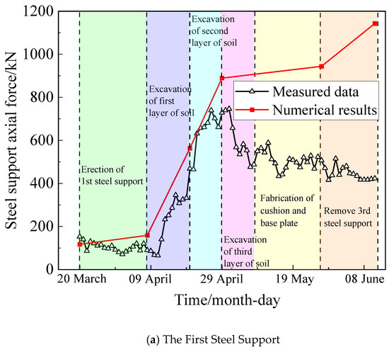 The numerical results of the axial force of the first steel support and the measured results are shown in Figure 15a. The numerical results are larger than the measured results, but the general trends of the two coincide. Especially before the excavation of the third soil layer, the maximum error between the numerical results and the measured results is not more than 12%. In the excavation of the third layer of soil and the subsequent construction process, the numerical results showed an increasing trend, while the monitoring results showed a gradual decrease and finally remained stable, which is mainly due to the fact that in these steps, the construction site is in the stage of the largest workload, both soil excavation and structural operations, so the steel support is more disturbed, which is prone to causing the DC joint to loosen and reducing the axial force of the steel support. Zhang [16] applied a DC joint in this pit project and monitored the steel support axial force, and the change rule of the monitored steel support axial force was more consistent with the numerical simulation results in this section; especially after the removal of the third steel support, the axial force of the first steel support increased significantly. Therefore, it is further verified that the decrease in the first steel support axial force in the third soil excavation and the subsequent construction process is caused by the shortening of the steel support due to the loosening of the steel wedge.