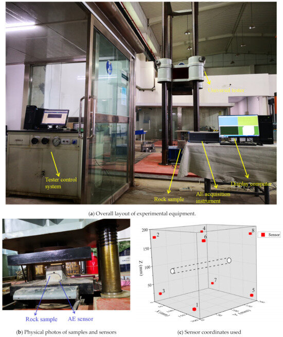 The model of the AE acquisition equipment used was DS5-16, and the number of sensors used was 8. The signal transmission rate of the AE acquisition instrument was 113 MB/s, and the response frequencies of the sensors were all 50–400 kHz; the center receiving frequencies were all 150 kHz (the sensors used were of the piezoelectric type, which could measure vibration signals in a single direction and convert them into voltage to characterize vibration intensity). In order to collect vibration information more accurately, a higher sampling frequency of 6 MHz was adopted. The input signal range of the system was ±10 V, and the dynamic range was ≥82 decibels. Due to the relatively small amplitude of the vibration signal, the signals were amplified at a fixed ratio (the preamplifier was 2.5 kHz–2.4 MHz) and converted into a voltage signal. In order to better reflect the rock burst tendency, the rock sample size was designed as a 200 mm cube, and a 20 mm hole was set in the middle of the sample. The material of the sample was a sandstone that had been manufactured by the manufacturer, with a uniaxial compressive strength of about 70 MPa. After testing, the propagation speed of longitudinal waves was 1989 m/s. Although the sample had heterogeneity and could not be calculated using the same value, this problem is now difficult to solve. At least this value should be determined first to better ensure positioning accuracy. The sensors were pasted onto a cubic sample through a special liquid medium, and the specific coordinates were shown in Table 1 (using the coordinates in Figure 1c as the coordinate origin). The reasons for setting up sensors in this way were twofold: firstly, the monitored events were best included in the sensor network; secondly, considering the spatial expansion, the stronger the spatial misalignment of the sensors, the more accurate their positioning was. Also, the study drew on the experience of previous sensor designs, considering that the current solution was reasonable.