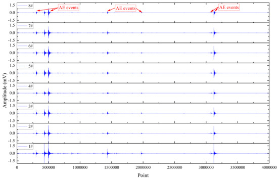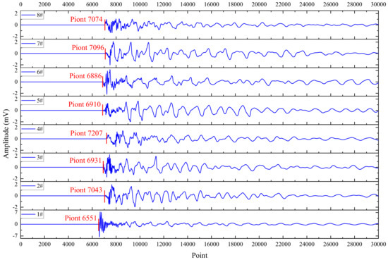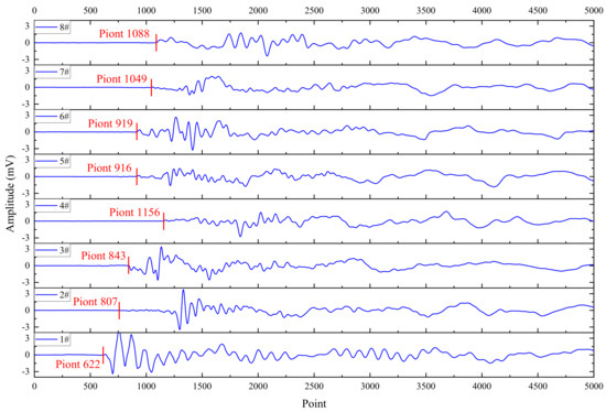 In order to better display the specific waveform morphology of each AE event, it was necessary to reduce the horizontal scale of each event for a detailed display, and a case waveform I of an AE event that occurred relatively early was denoted in Figure 3. The results showed excellent event waveform states and clear take-off points for each sensor (the take-off point represented the starting point of the vibration waveform when it suddenly increased from a smaller level to a larger level). After the rock fracture occurred, the first sensor to arrive was sensor 1#, with a take-off point of 622. The location of the rupture phenomenon was closest to sensor 1#, resulting in an earlier take-off time and a larger amplitude. The subsequent arrivals were sensors 2#, 3#, 5#, 6#, 7#, 8#, and 4#, with take-off points of 807, 843, 916, 919, 1049, 1088, and 1156, respectively. After arranging in order from morning to evening, the difference in arrival time between adjacent sensors was 185, 36, 73, 3, 130, 39, and 68, respectively. The distance differences between adjacent sensors (the distance difference between different sensors and the point where the fracture event occurred) were 0.061 m, 0.012 m, 0.024 m, 0.001 m, 0.043 m, 0.013 m, and 0.023 m, calculated based on the propagation velocity of the rock elastic wave of 1989 m/s. From the perspective of amplitude attenuation sequence, it was exactly opposite to the arrival time, which fully conformed to the law of event occurrence. At a signal propagation speed of 1989 m/s, the corresponding distance difference for one point is 0.33 mm. The location of the rupture was basically the same as the distance between sensors 5# and 6#, with a difference of only about 1 mm. Overall, the case waveform I fully conformed to the characteristics of rock failure, the amplitude attenuation followed a normal pattern, and the take-off points were all clear. In the case of clear take-off points, by combining the time difference and distance difference mentioned above with the specific coordinates of the sensor, the location of the rupture event could be accurately determined through suitable algorithms.