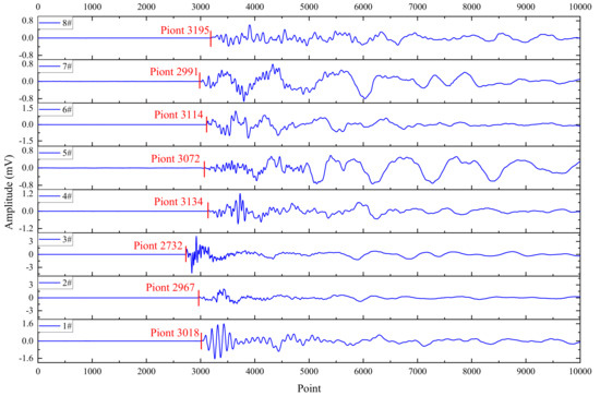 The same thing displayed above happened to case waveforms II and III, as shown in Figure 4 (case waveform II) and Figure 5 (case waveform III). Using the same method to analyze the two waveforms, the results showed that the earliest arrival time point was 2732 of sensor 3# for case waveform II, and the subsequent arrivals were sensor 2#, 7#, 1#, 5#, 6#, 4#, and 8#, with take-off points of 2967, 2991, 3018, 3072, 3114, 3134, and 3195, respectively. After arranging in order from morning to evening, the differences in arrival time between adjacent sensors were 235, 24, 27, 54, 42, 20, and 59, respectively. The distance differences between adjacent sensors (the distance difference between different sensors and the point where the fracture event occurred) were 0.078 m, 0.008 m, 0.009 m, 0.018 m, 0.014 m, 0.007 m, and 0.020 m, calculated based on the propagation velocity of the rock elastic wave of 1989 m/s. Similarly, the location of the rupture event (case waveform II) could be accurately determined through suitable algorithms when the take-off points were clear.