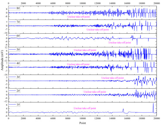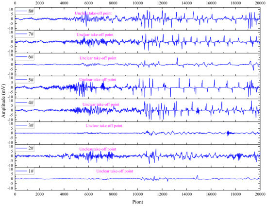 The three cases above demonstrated good waveform and event morphology, but the extracted subsequent events were somewhat different. Case waveform IV (which occurred during the transitional phase) in Figure 6 showed that only sensors 3# and 7# have slightly noticeable take-off points, and the take-off points of other sensors cannot be obtained at all. On the horizontal scale of the abbreviation, the event appeared to have no problem and could display obvious waveform characteristics, but when the event was magnified, it became noticeably different. The amplitude of the event on different sensors increased significantly, the bottom noise of the waveform increased significantly, and the waveform became somewhat distorted after the unclear take-off points. From the sequence of unclear take-off points in the waveforms, it conformed to the basic rules of the event and could be determined as an event waveform. However, it was significantly different from the previous three case waveforms, with a stronger rupture, resulting in unclear take-off points for most sensors. The shape of the waveform also shows that as the degree of damage increases, the waveform becomes distorted.