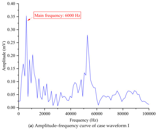 From the above results, it can be seen that the initial three case waveforms were more conventional, but the later three case waveforms exceeded cognition. The results indicated that the initial failure was relatively calm, while the later failure appeared more severe. In order to gain a deeper and clearer understanding of the phenomenon, the dominant frequencies of six case event waveforms were presented, and the results of the initial three waveforms (case waveform I, case waveform II, and case waveform III) were shown in Figure 9 (obtained through Fourier transform). The results show that the dominant frequencies of the initial three events were 6000 Hz, 5400 Hz, and 4321 Hz, respectively, and the spectral distributions were relatively clear and simple. From the position where the maximum amplitude appears, all three main frequencies were relatively small, indicating that the early failure was indeed relatively peaceful. The simplicity and clarity of the spectral curve may further confirm the regularity of the event waveform, which may lead to a smoother analysis and subsequent use of the location.
