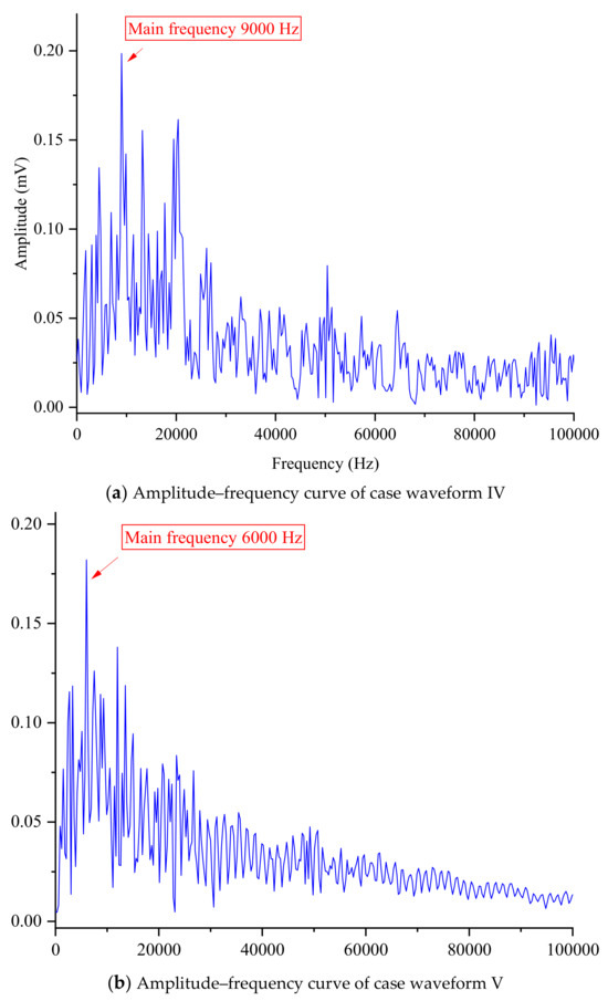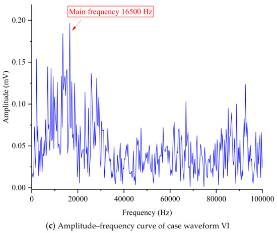 The spectral characteristics (obtained through the Fourier transform) of the three case waveforms IV, V, and VI that occurred during the later stage are also denoted in Figure 10. The results showed that the dominant frequencies of the three event waveforms were 9000 Hz, 6000 Hz, and 16,500 Hz, respectively, and compared to the previous three waveforms, the dominant frequencies of the latter three waveforms were more complex. Although one of the dominant frequencies was the same as one of the previous three waveforms, both at 6000 Hz, the main frequencies of the other two waveforms were clearly higher. The three waveforms in the later stages need to be amplified to determine the specific values of the dominant frequency, which are different from the previous three waveforms. This may indicate that the failure in the later stage was indeed more severe and difficult to analyze and utilize. When encountering such waveform performance and corresponding dominant frequency characteristics in the later stage, researchers should pay special attention and not ignore the positioning process but blindly believe in the location results provided by the built-in software. Such errors were likely to lead to incorrect positioning results and misjudgment of the location of failure, thereby affecting subsequent research results.