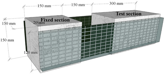 To study the bond performance of HTRCS composite reinforced concrete members, double shear specimens were designed and fabricated to carry out interfacial bond tests. The dimensions of the specimens are shown in Figure 1. The test section was 300 mm × 150 mm × 150 mm, and the fixed section was 150 mm × 150 mm × 150 mm. The thickness of resin concrete was 20 mm and 40 mm, and the dimensions of steel wire mesh (transverse × longitudinal) were 13 mm × 25 mm, 15 mm × 25 mm, and 30 mm × 25 mm, respectively. The interfacial test section was bonded at a length of 300 mm and a width of 120 mm to ensure sufficient and effective bond length to observe strain transfer. The bond length of the fixed section was 150 mm, while the clip was used to apply pressure in the normal direction to enhance the interfacial bond. Before casting the HTRCS composite, the concrete interface needs to be cleaned to keep the interface clean.