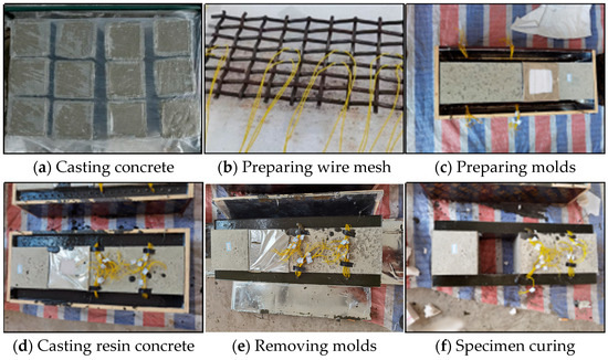 The mix ratio of resin concrete used for the specimens [23] was resin colloid:hardener:continuous graded aggregate = 4:1.16:24.84. The material properties of resin concrete and ordinary concrete were measured according to Chinese codes [25]. The compressive strengths of C30, C40, and C50 ordinary concrete were measured to be 30.1, 42.3, and 54.6 MPa, and the tensile strengths were 2.35, 2.77, and 2.98 MPa, respectively. The tensile strength was 7.8 MPa, the modulus of elasticity was 12,500 MPa, and the compressive strength of resin concrete was 102.3 MPa [23], as shown in Table 2. The yield strength of steel wire mesh was 412 MPa.
