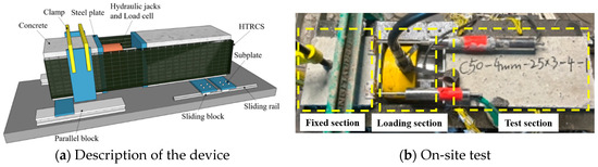 The test setup used in this test is shown in Figure 3. The test setup consists of fixed, loading, and testing sections, in which the loading section includes load cells and hydraulic jacks. In the fixing section, normal pressure is applied using a clamp to improve the interfacial bond between the HTRCS composites and the concrete, thus ensuring that the damage occurs in the test section. In addition, the specimen should be kept parallel to the slide throughout the test to ensure that the specimen can slide freely with the rail. The loading level difference was about 1 kN, and the loading interval between two adjacent levels was about 3 s. When the displacement suddenly increased or the load increase rate slowed down, displacement-controlled loading was used, with a loading rate of 0.02 mm/s.