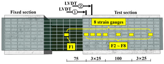 Figure 4 shows the arrangement of the strain measurement points of the wire mesh, and the specimen displacement measurement points. The first strain gauge, F1, is used to simulate the strain at the free end and is positioned in the middle of the loading section. Strain gauges F2–F8 are set on the test section to measure the strain in the test section. In addition, two Linear Variable Differential Transformers (LVDTs) were installed at the front of the test section to measure the relative displacement of the specimens.
