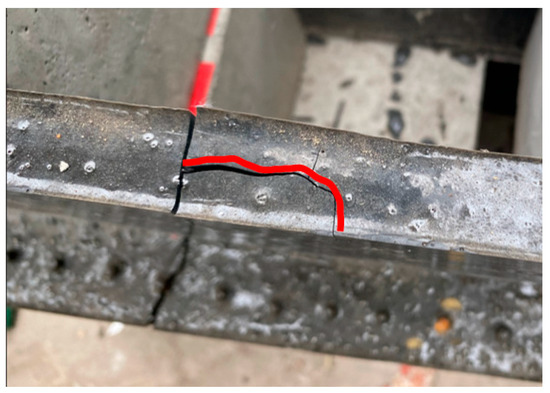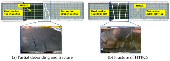 The specimen extended interlayer cracks at the vertical cracks, as shown in Figure 6. Due to that, the resin concrete in the HTRCS composites pulled off when the specimen was damaged, and the resin concrete was squeezed by the wire mesh; thus, the interlayer cracks appeared. Furthermore, the bond between the wire mesh and the resin concrete was good during the whole test, and no significant slippage occurred.