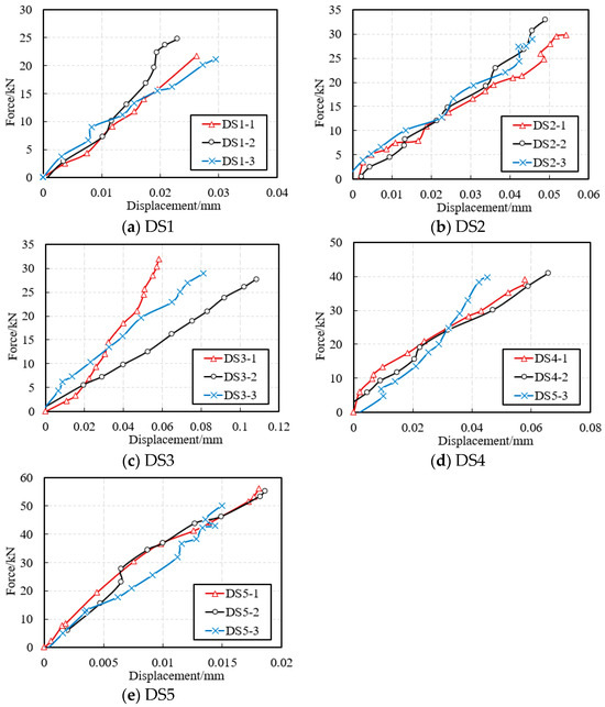 Figure 7 shows the force-displacement curves of the double shear specimens. The results of maximum load Pmax, average maximum load , displacement S, and average displacement of the specimens are shown in Table 3. The relationship between force and displacement was basically linear for all specimens. This is due to the fact that the resin concrete in HTRCS composites is a linear elastic material, and the wire mesh did not yield when the resin concrete reached its ultimate strength. Therefore, HTRCS composites can be treated as linear elastic materials, the interfacial bonding is sufficient, and no interfacial peeling occurs, so the load-displacement curves are basically linear.