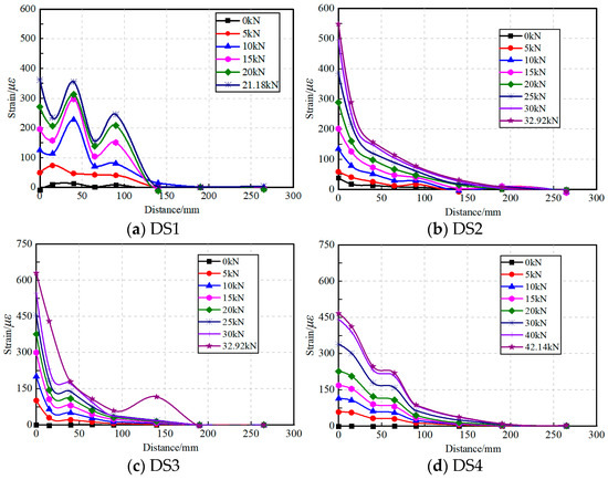 The DS1 specimen was damaged when the strain reached 400 με, while the strains of the DS2 and DS3 specimens reached 600 με, which is close to the ultimate tensile strain of resin concrete. Meanwhile, the stress transfer distance is about 140 mm for the DS1 specimen and 190 mm for the DS2 and DS3 specimens. A comparison of the DS1, DS2, and DS3 specimens shows that as the strength of the concrete increases, the bonding effect between the interfaces is enhanced, the HTRCS composite is more fully utilized, and the strain transfer range is increased.