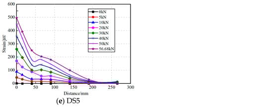 The strain transfer distance of the DS4 specimen is about 190 mm, and that of the DS5 specimen is about 260 mm. By comparing the DS4 and DS5 specimens, it can be seen that with the increase of the reinforcement rate in HTRCS, the strain transfer distance increases and the stress transfer effect is more significant.