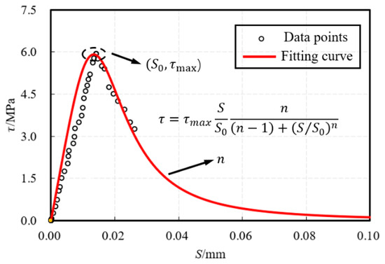 After plotting the local stress-slip curves, the local stress-slip relationship closer to the free end is selected for fitting the overall stress-slip curve. In addition, the stress-slip model is compared to the formulae presented in [27,28], in which the model shape is controlled by three parameters with the following expression: