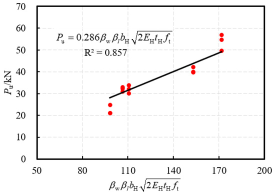 In the above established formula for calculating the interfacial bond bearing capacity of HTRCS composite material and concrete, the interfacial bond coefficient k is unknown. Through regression analysis, k = 0.286 is obtained, and the square of the correlation coefficient is found to be 0.857, as shown in Figure 11.