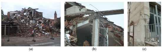 Emilia, Italy—2012: (a) RC structure collapsed in Cavezzo; (b) inadequate reinforcement joint detail; (c) damage of columns due to inadequate detailing for confinement.