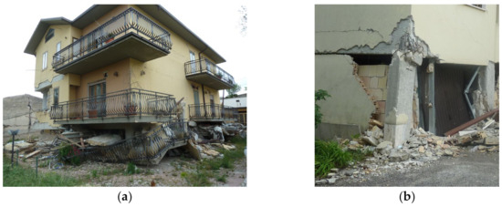 L’Aquila, Italy—2009: (a) damages on RC structure in L’Aquila; (b) node damage of reinforced concrete elements.