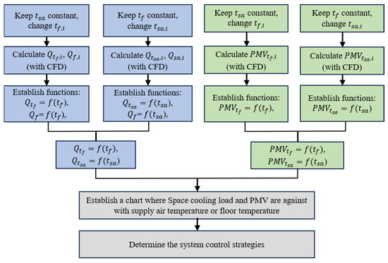 - Supply air temperature and cooling floor surface temperature were taken as the control variables, and the cooling capacity of the combined system and the comfort index of PMV were linear with these two temperatures, respectively. Based on the functions, the optimal region was determined. In this region, the supply air temperature and the floor surface temperature had significant impacts on the comfort index of PMV, while only a slight impact on system cooling capacity. Thus, indoor comfort should be considered as a priority, and corresponding steps have been proposed for system adjustment.