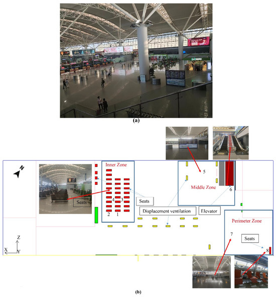 Measurement area and testing point location. (a) Interior view of terminal 3. (b) Distribution of testing points on 22 July 2021.