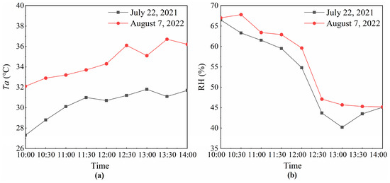 The on-site measurements were carried out twice, in the years 2021 and 2022. The first measurement was conducted from 8:00 to 19:00 on 21 and 22 July 2021. The average temperature during the day was 30.4 °C, and the average relative humidity was 53.1% (Figure 4). According to historical weather data for the area, the average outdoor temperature is 30.7 °C, so the weather on 22 July 2021 can be regarded as a “typical summer day”.