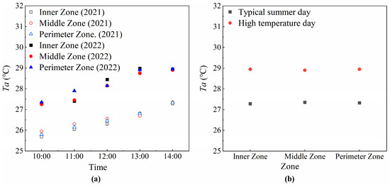 The horizontal temperature distribution at the height of 1.1 m is shown in Figure 5. During the testing period (10:00–14:00), the regional air temperature increased with time. Compared to the indoor air temperatures observed on a typical summer day, these temperature values were significantly higher on the high-temperature day. The air temperature of the inner zone on the typical summer day increased significantly as outdoor temperature increased (Figure 5a), followed by the perimeter zone, while the temperature of the middle zone increased slowly. This was because the inner zone temperature was affected by personnel activities, internal charging stations, and other service equipment. The temperature increased as the number of people increased, and the service equipment was more frequently used. Although 10 displacement air vents were installed in the zone, the wind speed was as low as 0.1 m/s at that time and was obstructed by chairs. An elevator operated in the middle zone, which had a large heat dissipation capacity. However, the airflow could not be effectively delivered to the vicinity of the elevator, even though the average supply temperature was 22 °C. Hence, compared to other areas, the air temperature appeared slightly higher from 10:00–12:00. However, from 12:00 to 14:00, since the middle zone was minimally impacted by the outdoor environment, the air temperature did not increase as significantly as in the other two zones. As Figure 5b illustrates, no significant difference in the average air temperature was observed among these three zones in the daytime, although the perimeter zone was mainly affected by the heat transmitted through the ceiling and the glass curtain wall. This was mainly attributed to the effect of the cooling floor.