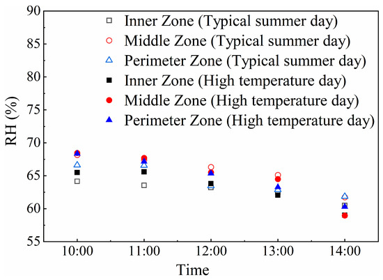 As Figure 6 illustrates, the relative humidity gradually decreased from 10:00 to 14:00, ranging between 58.95% and 68.45% at the height of 1.1 m, which met the comfort level II requirements of indoor air conditioning design criteria in summer (≤70%) [27].