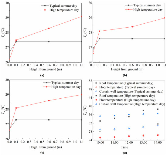(a–c) Vertical air temperature distribution at 14:00 at points 4, 6 and 8. (d) Floor temperature, curtain wall temperature, and roof temperature.