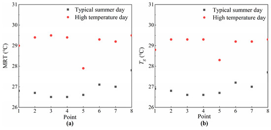 The mean radiant temperature was obtained by measuring the air temperature and the black ball temperature, and taking the black ball emissivity of 0.95 and the black ball radius of 0.075 m into Equation (9).
