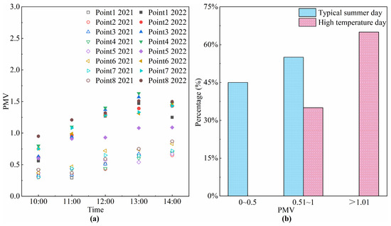 In addition, as shown in Figure 11a, the overall TSV value was 0.52 on the typical summer day, indicating that the environment was neutral-warm, and 86% of the people present believed that the current thermal sensation was within a comfortable range. On the high-temperature day, the overall TSV value was 0.87, and 59% of the people present thought that the current environment was slightly warm or warm. The air conditioning system was unable to effectively maintain the indoor thermal environment at the required comfort level on the high-temperature day.