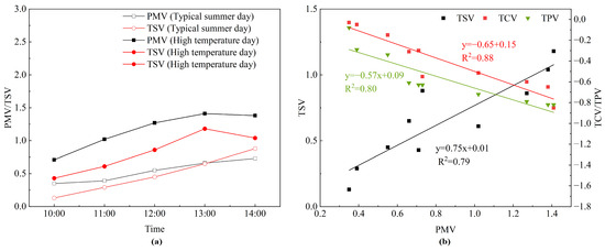 PMV vs. subjective feltings voting. (a) Average PMV and TSV values over time. (b) PMV verified by subjective feltings voting.