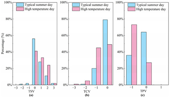 Figure 11c shows that the overall TPV value was −0.36 on the typical summer day, and 64% of the people present believed that there was no need to change the current environment; on the high-temperature day, the TPV was −0.73, and 73% of the people present hoped for a cooler environment.