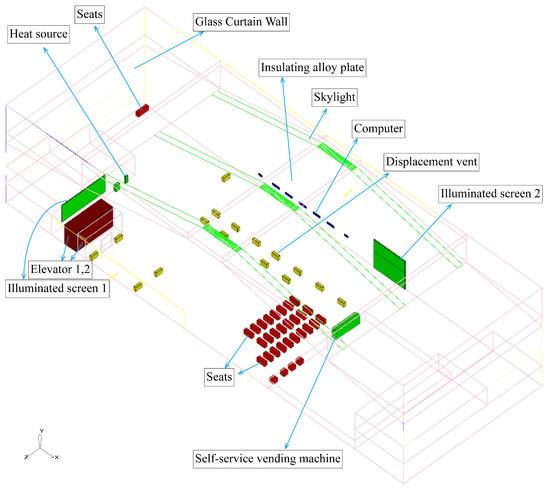 In recent years, many scholars have paid attention to the thermal comfort of large space buildings. Wang et al. [5] studied the IEQ (indoor environmental quality) of eight major airports in China through environmental measurements and questionnaires. They found that the black bulb temperature was 3–5 °C higher than the air temperature on average because of the glass curtain wall. Liu et al. [6] studied the thermal comfort of Terminal 1 of Chengdu Shuangliu International Airport in China. The results showed that the thermal neutral temperature of passengers was 21.4 °C in winter and 25.6 °C in summer, and the comfortable temperatures ranged from 19.2–23.1 °C and 23.9–27.3 °C, respectively. According to the questionnaires, 78.3% of the passengers were satisfied with the thermal environment, and 95.8% thought that the thermal environment was acceptable. Geng et al. [7,8] adopted the POE (post-evaluation) method to carry out passenger satisfaction tests and surveys for 11 terminals of 8 airports in 5 different climatic regions in China. They found that the subjective satisfaction survey results had a strong correlation with the calculation based on environmental parameter test. Jia et al. [9] studied the thermal comfort of passengers walking within an airport terminal. It was found that the cooling design parameters (25–26 °C, 50% RH) were not able to meet the thermal comfort level requirements if the walking time exceeded 10 min. Kotopouleas [10,11] conducted seasonal monitoring of indoor environments at three airports in the United Kingdom, and investigated 3087 passengers and staff. It was found that the outdoor temperature determined indoor personnel wear level, and the personnel had high thermal tolerance and a wide range of temperature acceptance. Pichatwatana [12,13] investigated environmental quality at Suvarnabhumi Airport in Thailand. It was found that the inside surface temperature of the glass roof was as high as 56 °C. The large glass roof led to high indoor radiant temperatures, and caused slight discomfort and dissatisfaction among employees.