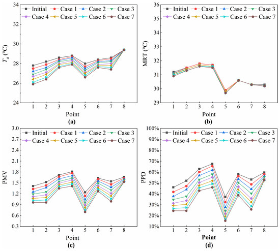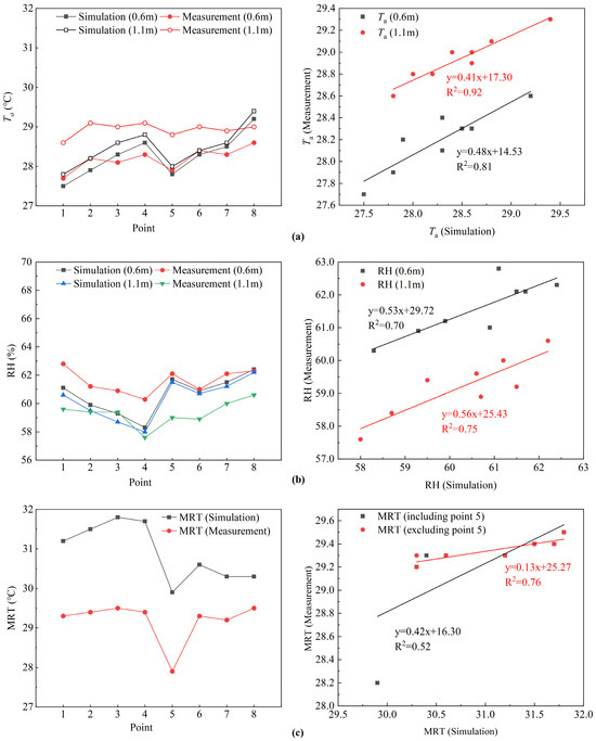 The CFD model was verified before the subsequent simulation and thermal environment analysis. As Figure 13 illustrates, the simulation results were basically consistent with the measurement results on the high-temperature day, and the relative error was within 15%. As Figure 13a,b illustrates, the simulated values of air temperature and relative humidity were close to the measured values, with relative errors within and the determination coefficients, R2, were higher than 0.7. The verification results show that the air temperature and relative humidity in the simulation strongly correlated with the measured values. As shown in Figure 13c, the relative errors of the mean radiation temperature ranged from 3% to 8%, but the determination coefficient, R2, was only 0.52. This means that some obvious errors existed between the simulation and measurement, and the most significant error occurred at point 5. Point 5 was surrounded by four displacement ventilation vents, as Figure 3 illustrates, and the wind speed was relatively higher than the other points on the high-temperature day, thereby affecting the radiation temperature. If the value at point 5 was ignored, the coefficient of R2 was as high as 0.76. Based on the statistical analysis, the CFD model can be used for subsequent environment analyses.