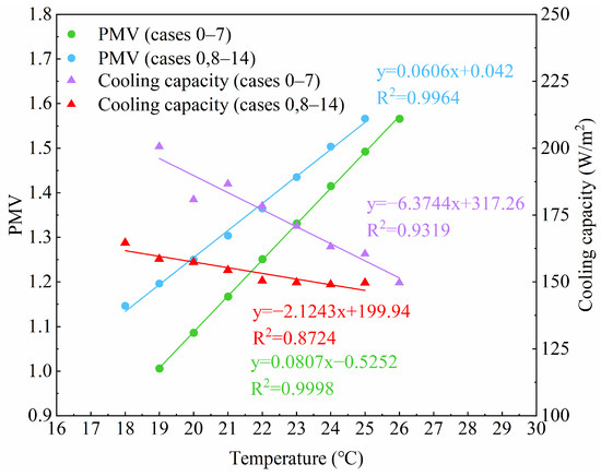 According to heat transfer between the human body and the environment [26], Equation (4) can be also expressed by Equation (6). Therefore, as Equations (7) and (8) indicate, PMV is also linear with the supply air temperature or cooling surface temperature, as the metabolism of the human body and the heat transfer coefficients, hc and hr, are generally constant in a static state.