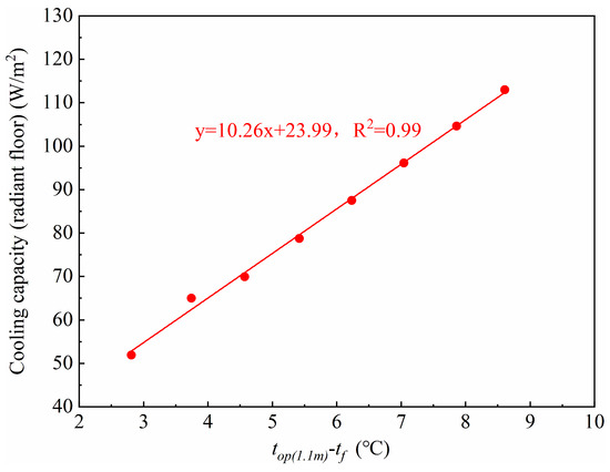 In addition, the calculation of operative temperature considered the impact of height, and was based on the proportion of the radiant cooling capacity. In fact, the ratio of radiant heat transfer in the space should be less than the estimate, so the real operative temperature should be higher, and the difference between operative temperature and floor surface was bigger than the assessment. Thus, the actual heat transfer coefficient of the floor surface should be slightly less than the current calculated value (10.26 W/m2). According to Figure 18, the cooling capacity of the radiant cooling floor should be 30.15–32.20 W/m2 when the outdoor air temperature is 32 °C, and the floor temperature was 26 °C on a typical summer day. The obtained value is basically consistent with the study conducted by Zhang et al. [3] and Zhao et al. [35], in which the cooling capacity was 30–40 W/m2. Therefore, the study result also acts as a reference for radiant cooling floor design in a large space.