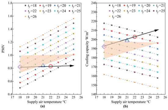 In order to meet comfort requirements while conserving energy, the radiant floor and ventilation system can be adjusted through reducing the air temperature or reducing the radiation floor temperature to maintain the PMV value and system cooling capacity within a reasonable region. According to the technical regulations for radiant heating and cooling [31], the supply air temperature should not be less than 18 °C, and the surface temperature of the radiant cooling panel should not be lower than 19 °C.