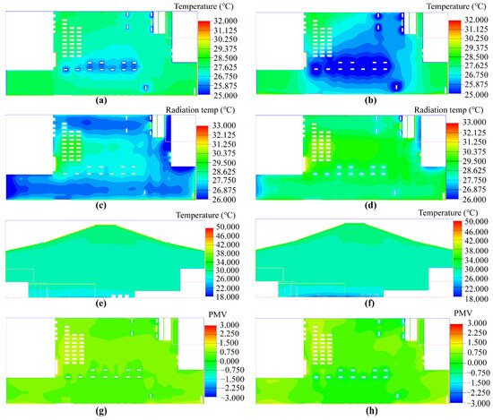 According to the simulation results, the air temperatures at the positions of the testing points were greater than 28 °C, the MRTs were greater than 30 °C, and the average PMV was 1.57. The environment was also in an overheated state. The average heat transfer rate on the floor surface (the capacity of the radiant floor) was 51.96 W/m2, the calculated heat exchange rate (the capacity of the ventilation system) of the displacement ventilation system was 97.76 W/m2, and the total heat exchange rate of the combined system was 149.72 W/m2. However, this rate could not meet the cooling demand on the high temperature day.