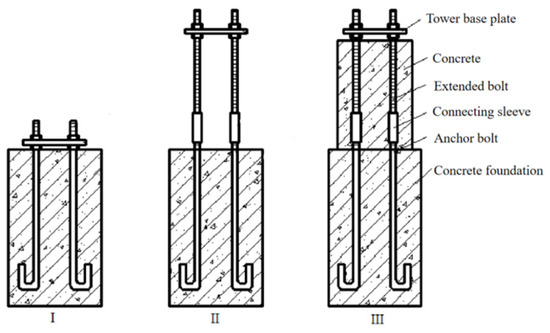 For transmission towers requiring emergency repairs, the first step is to determine the necessary height adjustment values for each tower leg. Subsequently, the corresponding adjustable base bolt scheme should be selected based on the required height adjustment values for construction. When carrying out repair work, the tower legs and base plate should be first raised to the desired height. Then, using pre-prepared sleeves, the original base bolts are connected to extended screws, and the base plate is connected to the extended screws using nuts. Finally, concrete is poured into the cavities of the extended screws and the base plate to complete the construction of the adjustable base bolt device. The structural composition and construction process of the AFB are depicted in Figure 2. In this figure, sections I, II, and III correspond to three states of a single tower leg during the repair process: pre-repair, representing the base without the adjusted leg height; during repair, showcasing the adjusted leg heights without the concrete filling; post-repair completion, illustrating the adjusted leg heights with the concrete filling to enhance the structural load-bearing capacity.