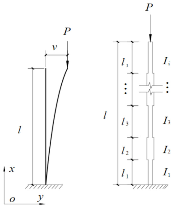 For a single bolt, when discussing its stability, the portion between its base plate and the concrete foundation can be simplified as a variable cross-section beam. This beam has n different moments of inertia, denoted as I 1 , I 2 ,..., I n , with an elastic modulus of E. Assuming the beam is fixed at the bottom and free at the top, we can hypothesize the deflection curve equation as