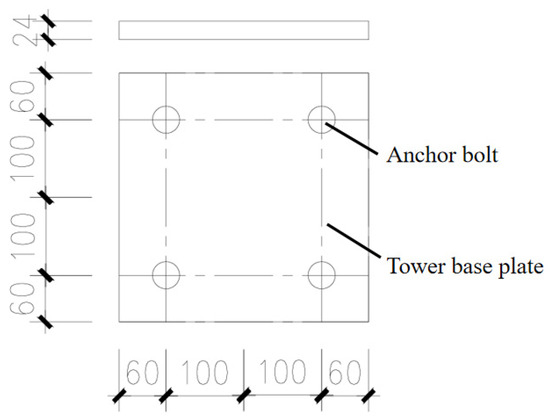 Using the general finite element software ANSYS for the numerical simulation of the AFB [27,28,29], full-scale modeling of the tower base plate and the extended part of the foundation bolts is conducted. The finite element foundation prototype is based on the relevant design from a certain provincial power design institute, selected for a certain transmission line project tower foundation. Through numerical simulation studies, comparing numerical solutions with theoretical solutions can validate the accuracy of the theoretical model and various calculation expressions, providing a basis for the design of the AFB.
