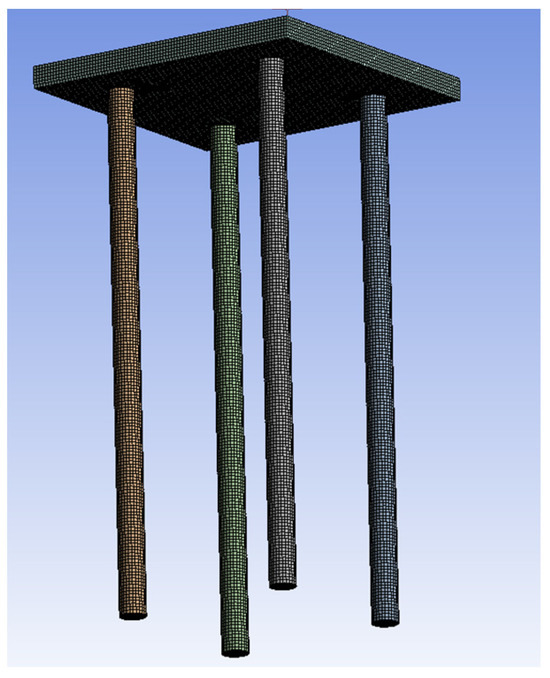 In the AFB without poured concrete, a single screw’s lower end is fixed in the concrete foundation, while the upper end is connected to the tower base plate. The dimensions of the AFB without poured concrete are shown in Figure 5, with the bolt length as l = 300   mm . For ease of analysis, this bolt section is treated as a uniform cross-section with a diameter d = 35   mm . The center-to-center distance between adjacent screws is a = 200   mm , and the material’s elastic modulus is E = 2.1 × 10 11   Pa , adopting the 5 mm Solid186 solid element. The established finite element computational model is depicted in Figure 6. We constrain all degrees of freedom at the lower end of the base bolt, while the upper end of the base bolt is connected to the tower base plate using nodal coupling for equivalence [30,31].