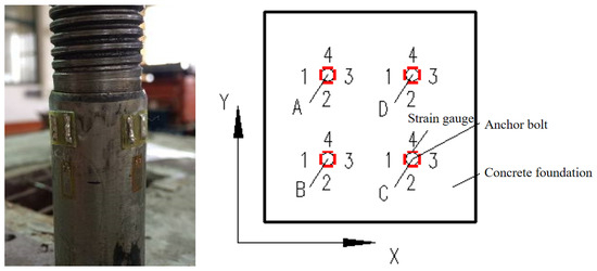Under the combined load, the maximum compressive stress is located at the lower end of the foundation bolt, with a maximum value of 291 MPa. By substituting the combined load (15) and the dimensions of the foundation bolt model into the expression for calculating the compressive stress under the condition of no concrete filling (14), the calculated value for σ is 278 MPa.